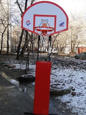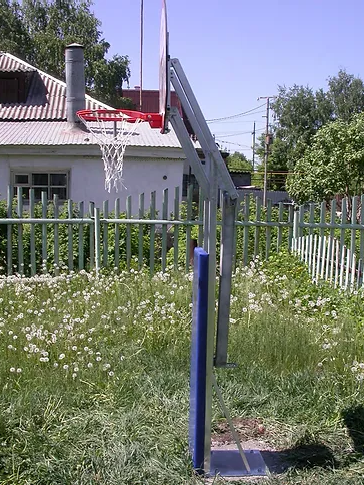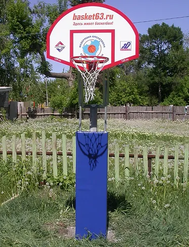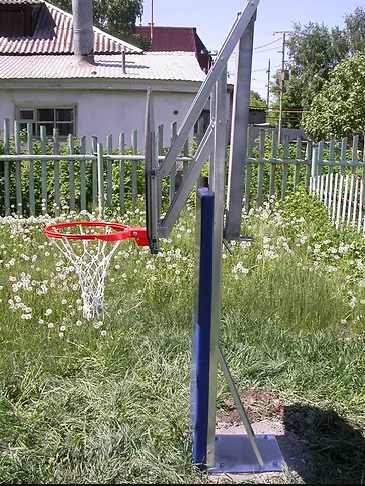 Стойка укомплектована баскетбольным щитом, подпружиненным кольцом с сеткой, анкером. Для предотвращения случайных травм при игре на передней части стойки устанавливается защитная панель – протектор.