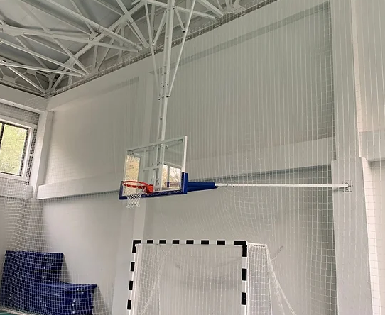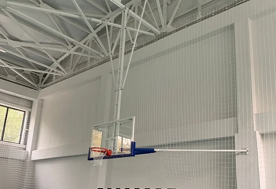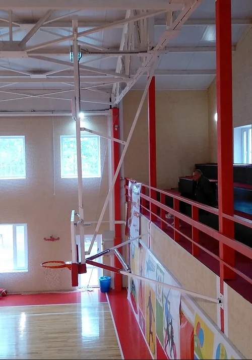 Навесные конструкции верхнего крепления подъемного типа, предназначены для игры в баскетбол в крытых спортивных залах. Навеска крепится на специально подготовленные направляющие на нижнем поясе ферм перекрытия крыши. Проектируются индивидуально под конкретное спортсооружение с учетом привязки к существующей разметке баскетбольной площадки.