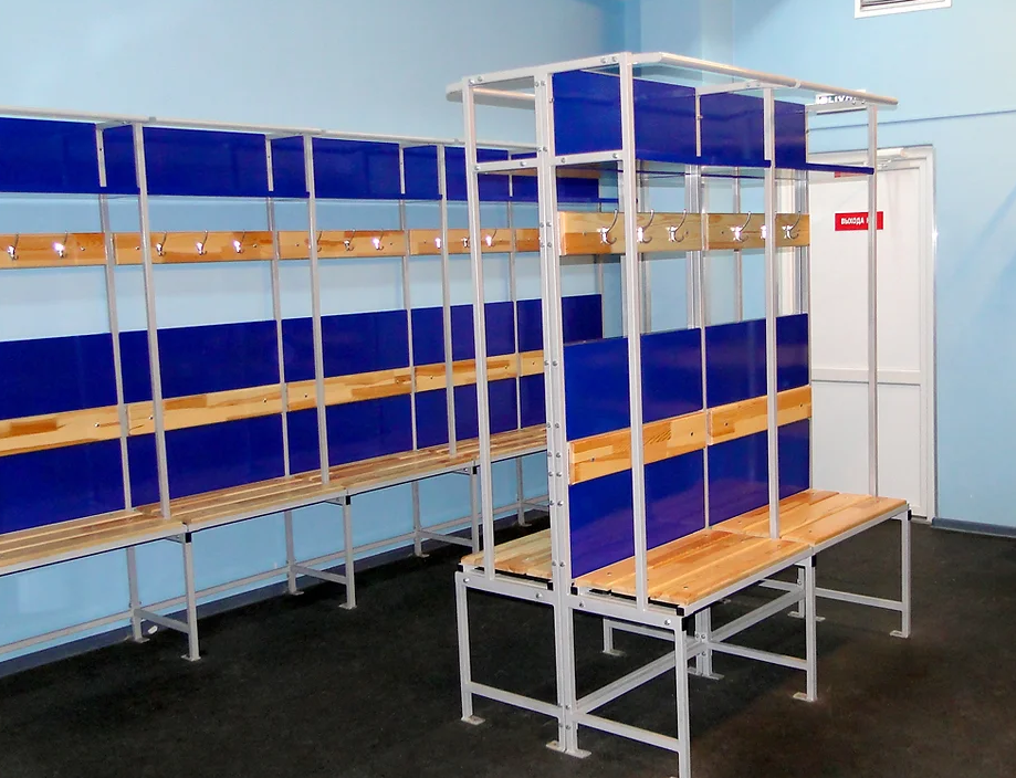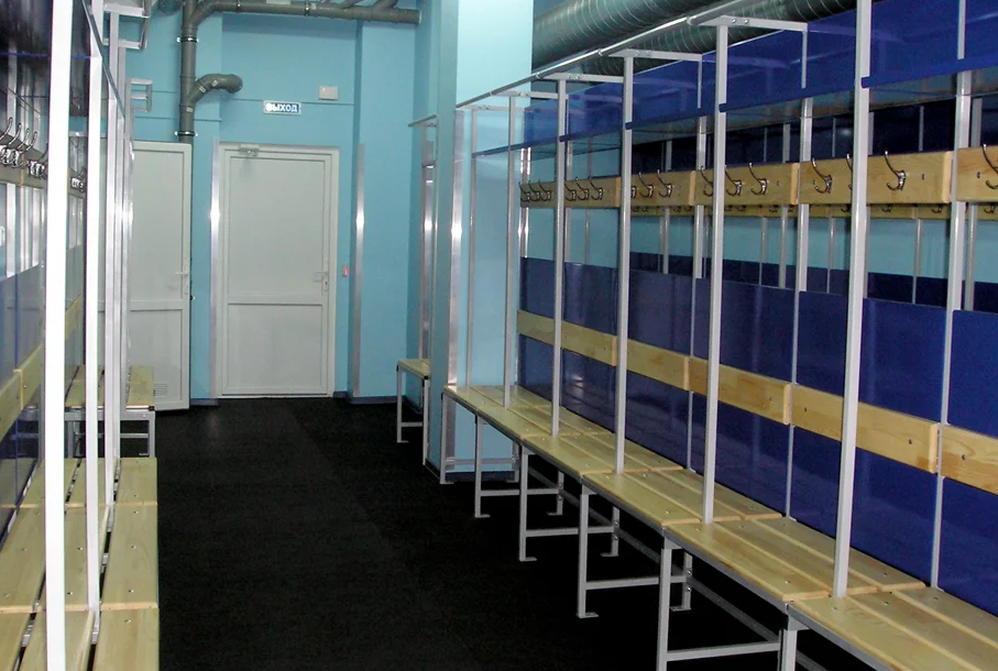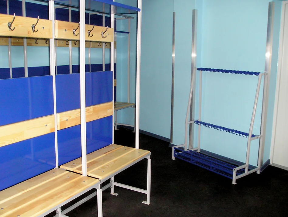 Индивидуальное место предназначено для переодевания хоккеистов и фигуристов. Для удобства предусмотрены: отсек для обуви, вешалка для одежды, сиденье со спинкой, полка для головного убора, штанга для плечиков. Конструкция сборная модульная. Состоит из боковин и промежуточных элементов.