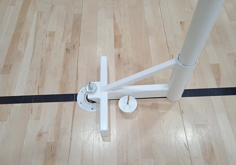 Применяется на деревянных спортивных полах. Стакан устанавливается на пол и фиксируется за задний конец анкером, предварительно смонтированный в бетонное основание пола.