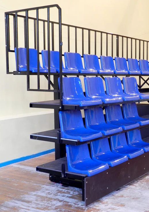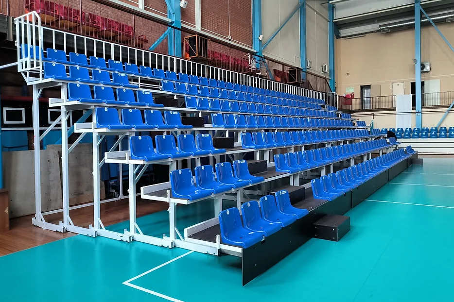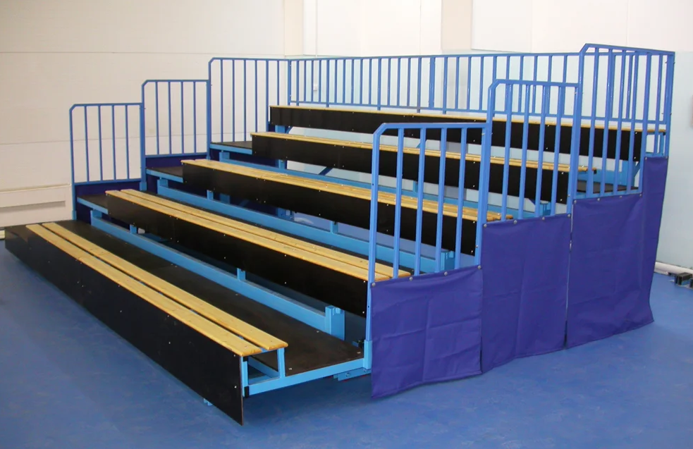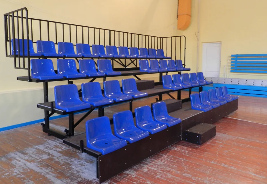 Трибуна телескопическая предназначена для размещения зрителей в закрытых спортсооружениях. Минимальное количество рядов - 3. Трибуна может оборудоваться сиденьями скамеечного типа или индивидуальными пластиковыми сиденьями. Пол в проходах - ламинированная фанера с сеткой.