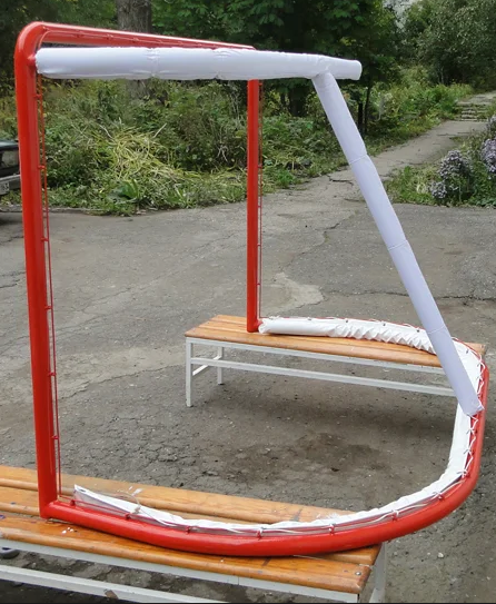 Для крепления сетки к воротам, на задних частях штанг, верней и нижней дуги имеются петли из прутка 8 мм. Вся конструкция ворот покрыта порошковой эмалью красного цвета.